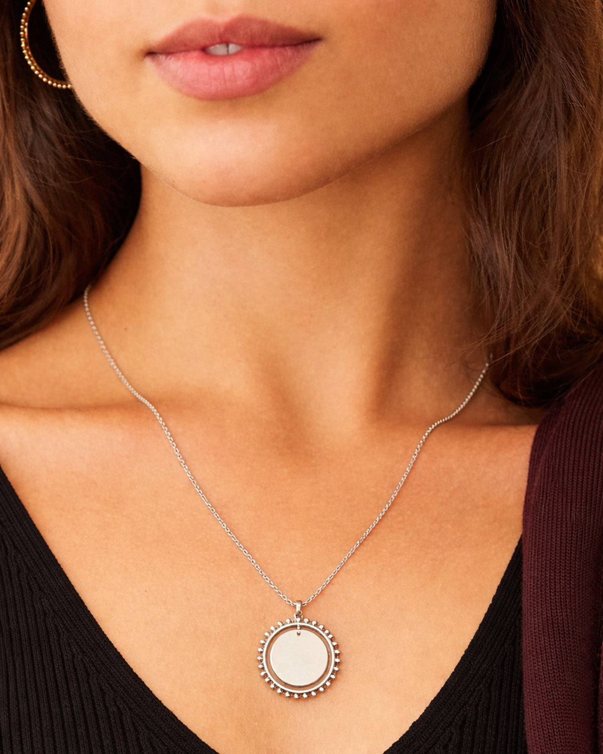 Facile à associer, ce collier médaillon perlé en argent accompagne aussi bien les tenues du quotidien que les moments plus précieux. Une pièce sobre et raffinée, qui traverse les saisons et sublime chaque silhouette avec discrétion.