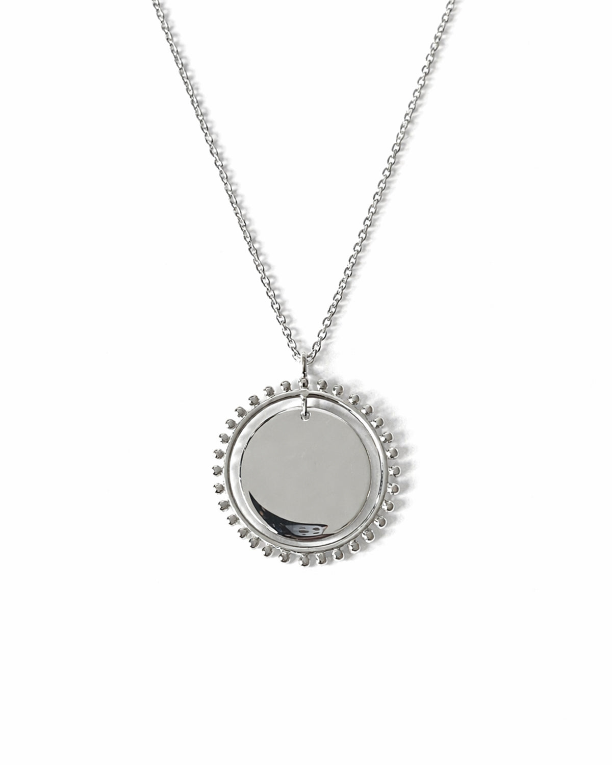 Épuré et lumineux, ce collier médaillon en argent 925 séduit par son design intemporel et sa symbolique subtile. Son pendentif rond à la surface polie miroir, entouré d’un délicat contour perlé, capte la lumière et reflète chaque mouvement avec élégance. Un bijou à la fois graphique et poétique, pensé comme un talisman du quotidien.