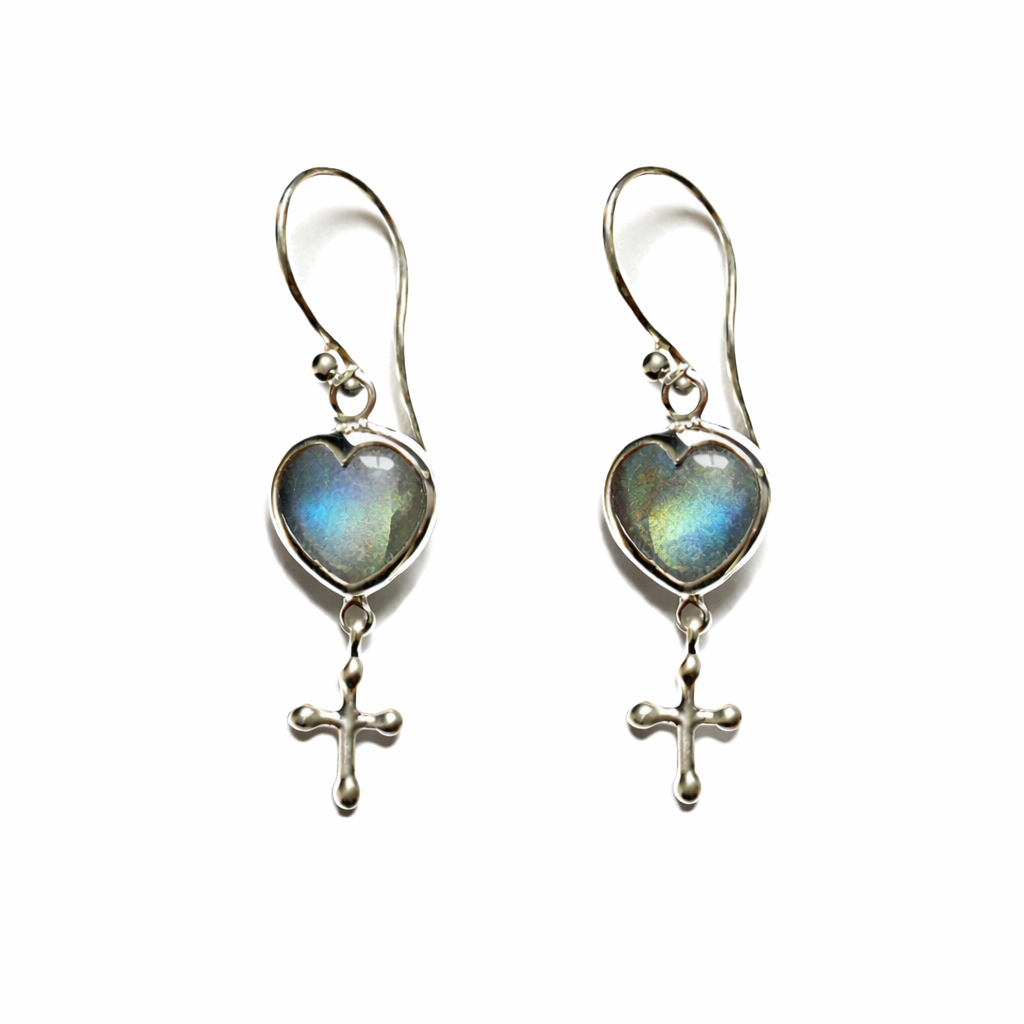 Boucles d’oreilles cœur labradorite & croix – argent 925 / vermeil